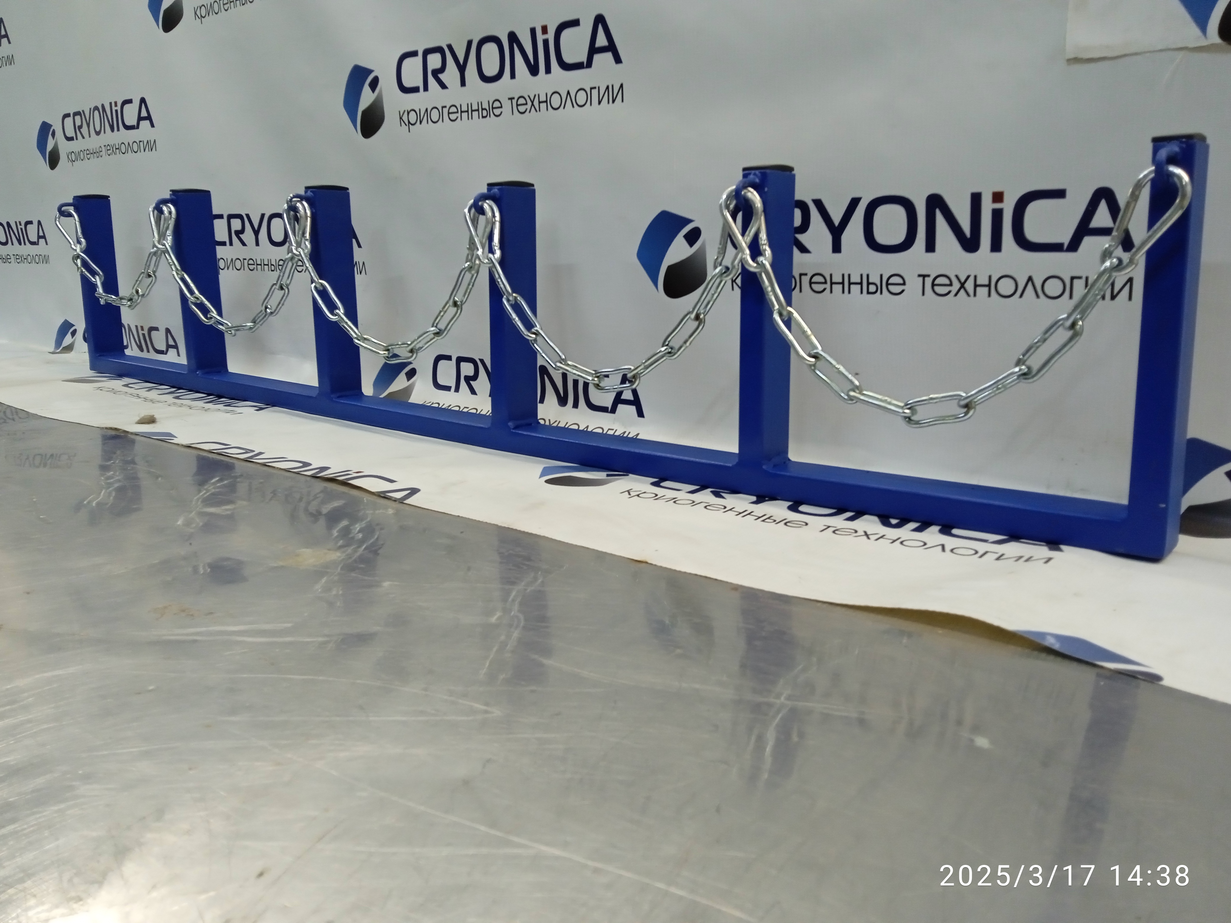 Ложемент для крепления к стене 5-ти баллонов 40 и 50 литров для кислородных (азотных, аргоновых) рамп (аналог КЕ 6802 000, КЕ 6801 000, КГ 6859 000, КГ 6861 000), котрые предназначенны для непрерывного централизованного снабжения потребителей техническими газами (азот, аргон, кислород, воздух, углекислота, водород, гелий) из сорокалитровых баллонов ГОСТ 949-73 под давлением до 20 МПа (200 кгс/см2). Ложемент выполнен их трубы 40х20х2, используется прочная длиннозвенная цепь и пожарные карабины №6. Изделие окрашено в 2 слоя высококачественной краской, создающей износостойкое покрытие.