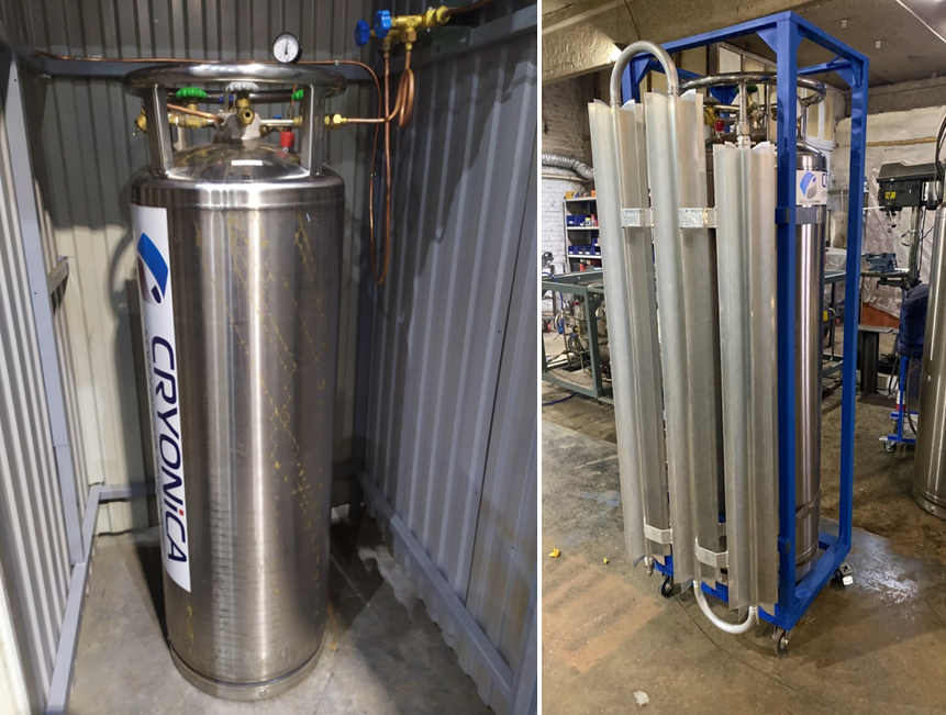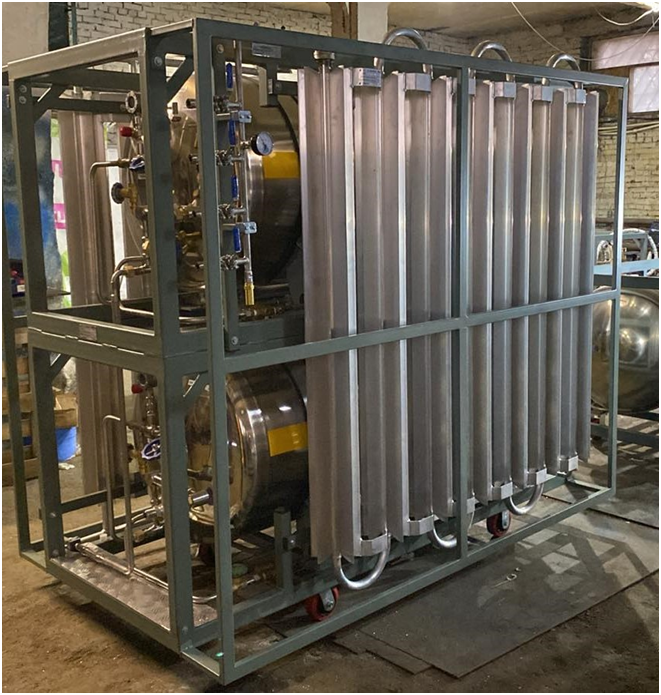 Газификатор — это криогенный аппарат, предназначенный для хранения сжиженных промышленных газов (кислород, азот, аргон, СПГ) и их дозированной выдачи в газообразном состоянии на технологическую линию под заданным давлением. По конструкции он представляет собой двустенный резервуар с эффективной изоляцией (экранно‑вакуумной или перлитной) — по сути «сосуд в сосуде», работающий по тому же принципу, что и термос. Экранно-вакуумная изоляция (ЭВИ) — это многослойная теплоизоляция, которая минимизирует теплопередачу с помощью чередования отражающих экранов (с низкой излучательной способностью) и вакуумных прослоек между ними. Такая конструкция эффективно снижает потери тепла, поскольку вакуум исключает передачу тепла теплопроводностью и конвекцией, а экраны отражают тепловое излучение. Этот тип изоляции широко применяется в криогенных системах, космической технике и других устройствах, где необходимо поддерживать экстремальные температуры, например, в криогенных резервуарах, СПГ-хранилищах и космических аппаратах. Перлитная изоляция — это теплоизоляционный материал, изготавливаемый из вспученной вулканической породы перлита, который используется для утепления зданий, труб и промышленного оборудования. Она обладает отличными тепло- и звукоизоляционными свойствами, негорючая, не подвержена гниению и воздействию вредителей. Минусом перлита является его объем, для достижения эффективной теплоизоляции объем межстенного пространства криогенной емкости должен составлять не менее 100% от объема внутреннего сосуда. Таким образом внешний сосуд получается тяжелым и большим по своим габаритам.