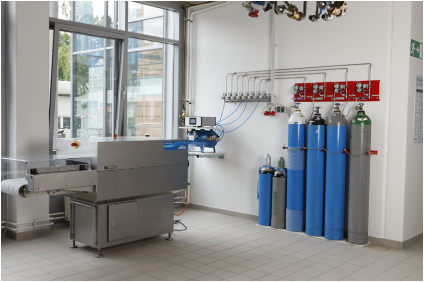 · Подключение баллонов: К рампе подключается необходимое количество баллонов с газом, что позволяет выбрать нужный тип газа для определенного процесса. Зачастую рампа оборудована системой автоматического переключения с пустого баллона на полный. Таким образом гарантируется беспрерывная подача на линию упаковки продуктов питания.