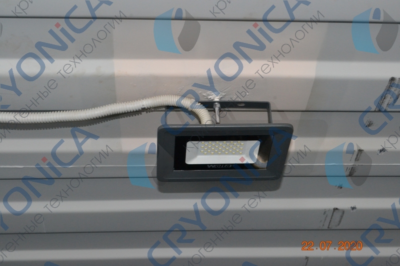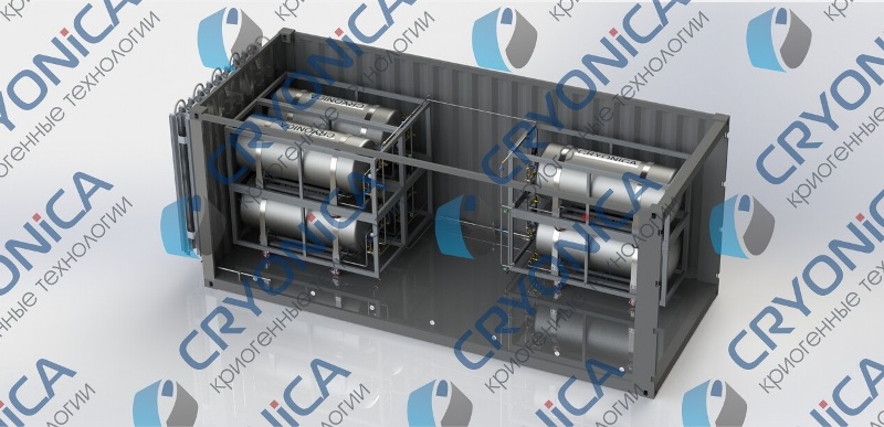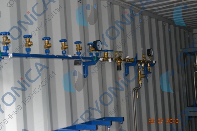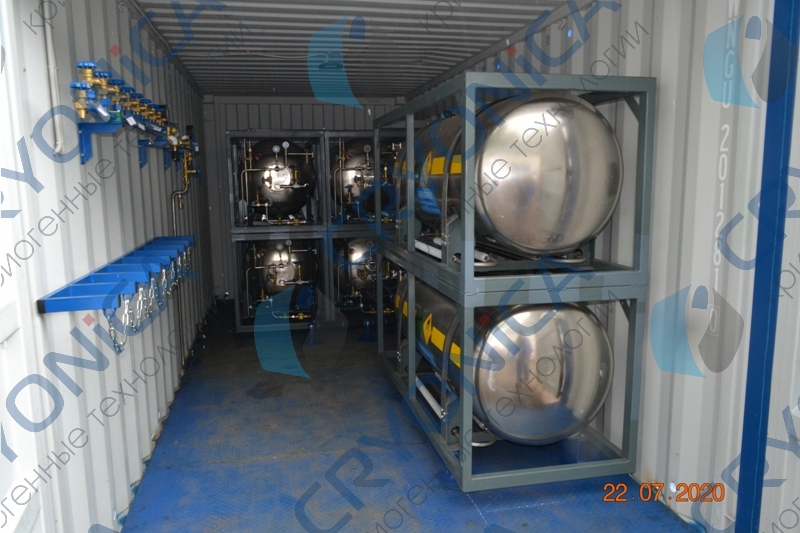 Данная установка состоит из шести сосудов (по 500л каждый), обвязанных в единую систему снабжения кислородом с общим испарителем производительностью 100м3/ч. Морской контейнер используется для размещения всех сосудов внутри себя, так же контейнер обеспечивает удобную транспортировку всей установки и безопасное хранение на территории инфекционной больницы.